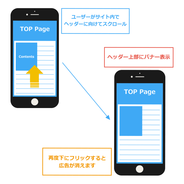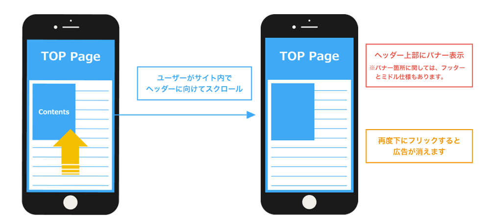 コンテンツの間から表示される為、ユーザーの目を引き関心を持たせることが可能です。