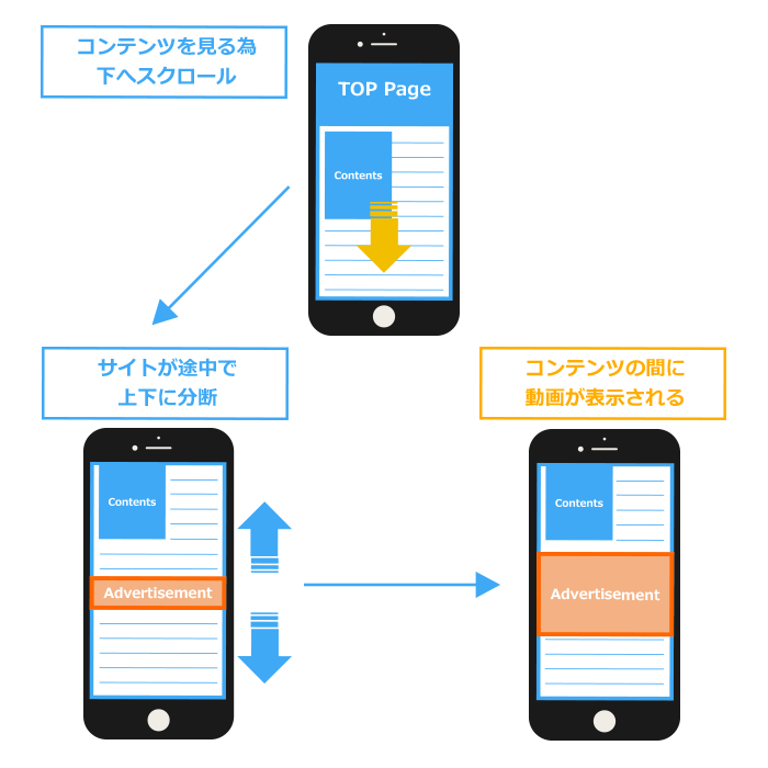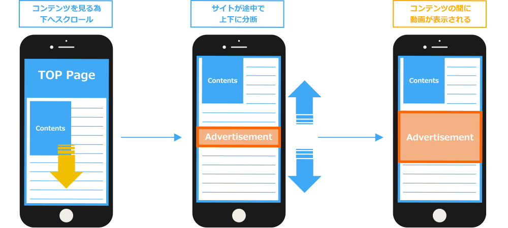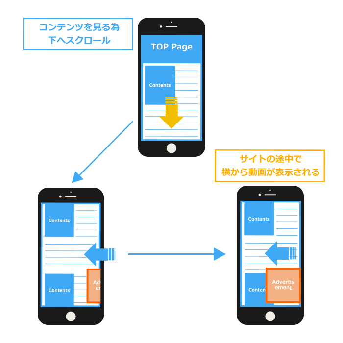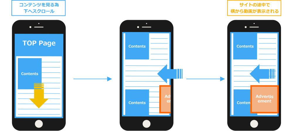 ユーザースクロールの動きに対してページの横から動画広告を表示させる手法です。