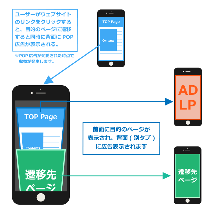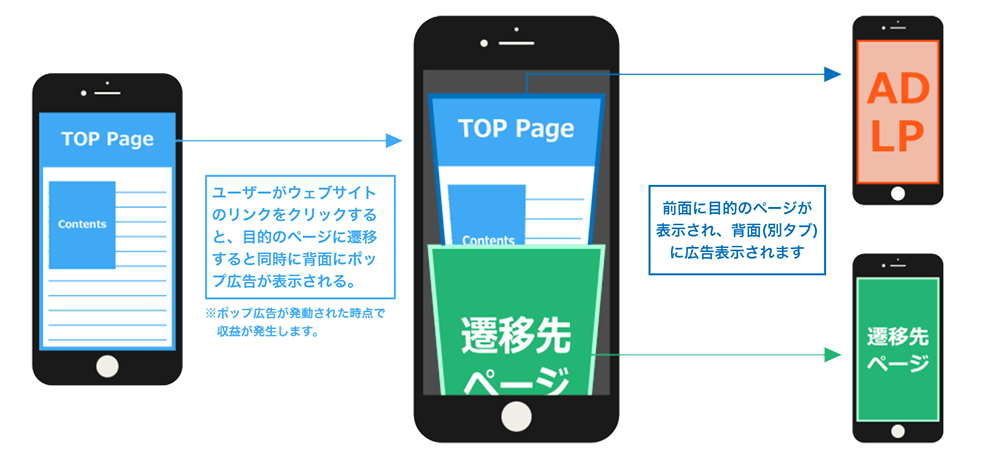 ポップ広告とは、ユーザーがアクション(リンクをクリック、動画再生、画像拡大など)を起こした際、別画面(ウィンドウ・タブ)で表示される広告です。